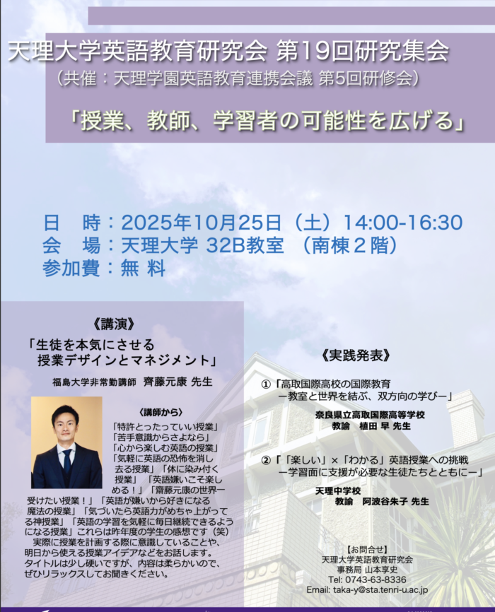 天理大学英語教育研究会第19回研究集会(共催:天理学園英語教育連携会議第5回研修会)のご案内