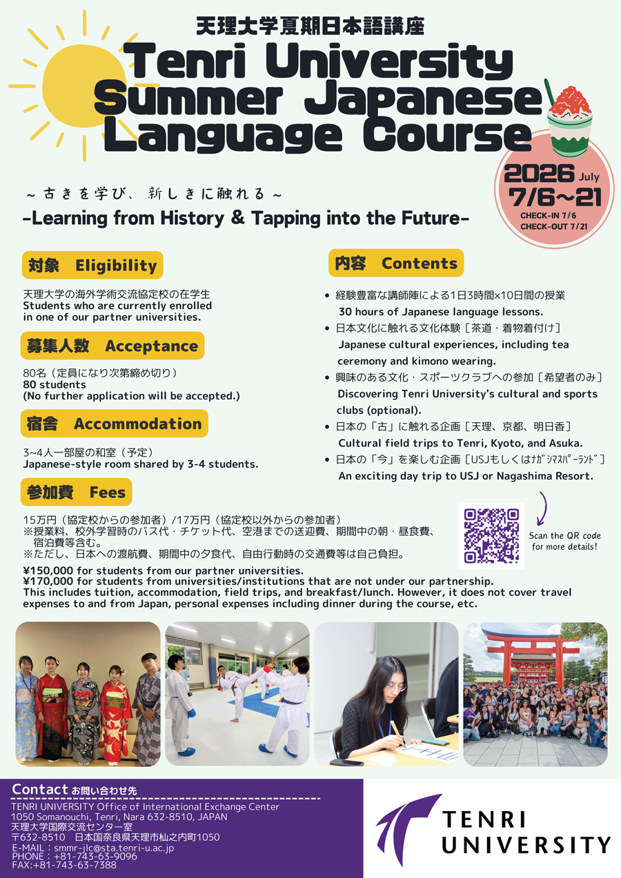 (Check-in: July 6th, Check-out: July 21st) - Eligibility: Students currently enrolled in universities with exchange agreements with Tenri University [Japanese language proficiency is not required]