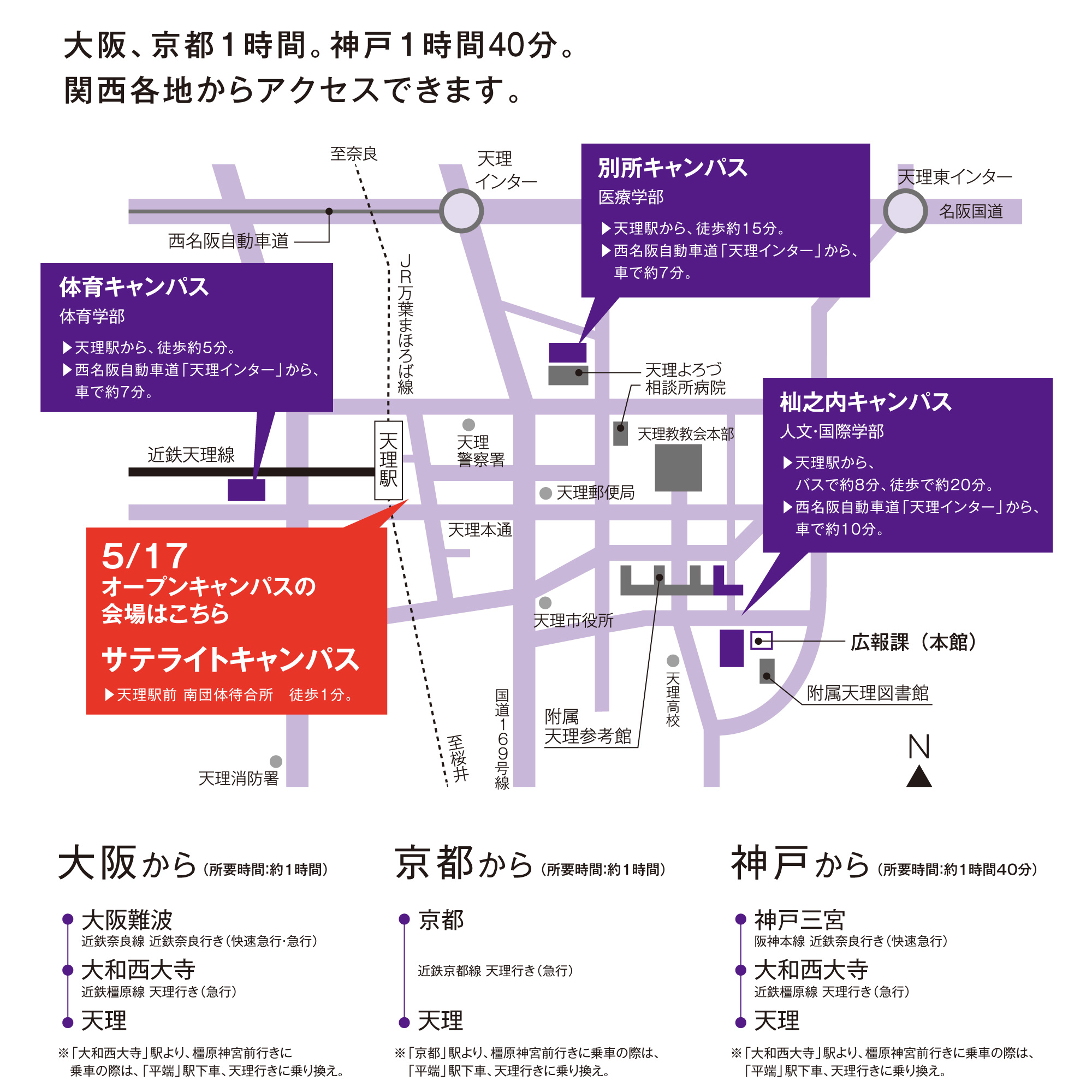 Q. 駐車場はありますか? → 天理駅前サテライトキャンパスには、公共の駐車場しかございません。お手数をおかけしますが、公共の駐車場をご利用ください。