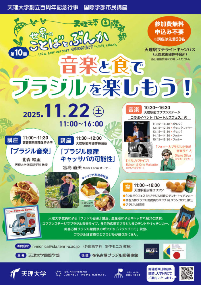 1925年の天理外国語学校の創設以来、天理大学では外国語教育の歴史と伝統を重ねてきました。「語学の天理」の伝統を引き継ぐ国際学部では創立100周年記念行事として、4月より、全12回にわたって国際学部市民講座「世界のことばとぶんか」を開催しております。