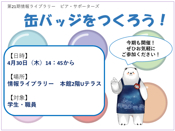 ※情報ライブラリーでは「ピア・サポーターズ」という学生グループが、平日3限から5限に活動しています。
