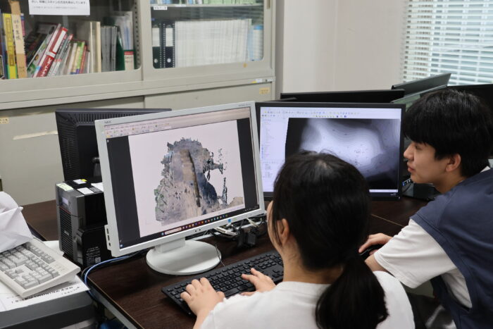 東乗鞍古墳のドローン撮影映像研究成果を図化する作業もデジタル化しています。データの解析や作図などの作業は研究室のパソコンを使って行います。近年急速に進む考古学のデジタル化に対応できるよう、これらの技術を一つ一つ身につけていきます。