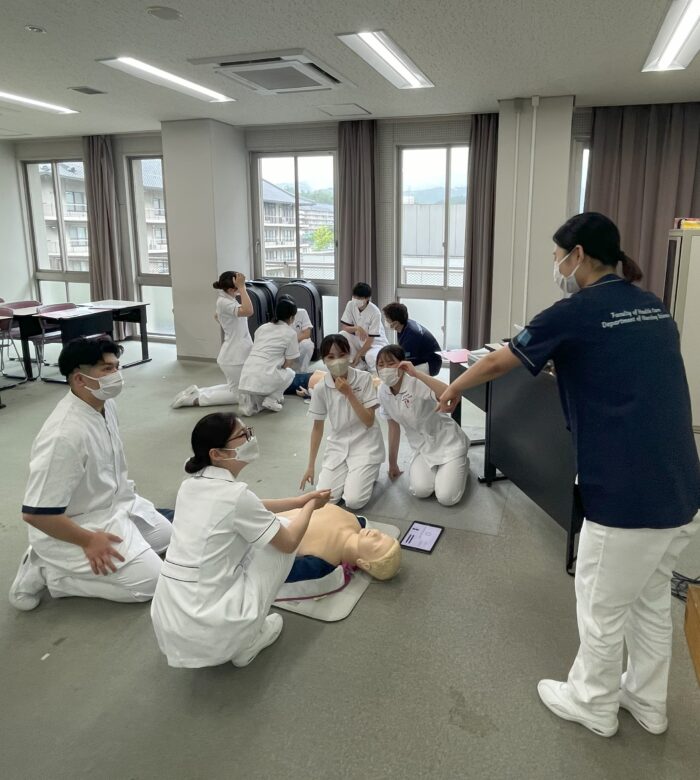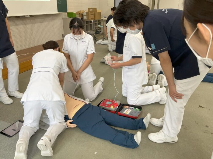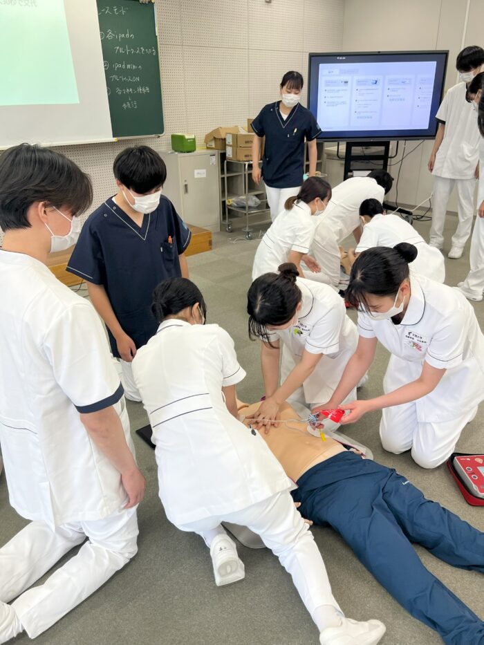 near‐peer teaching(NPT)とはここ数年、The Clinical Teacherやその他の教育雑誌で頻繁に取り上げられているトピックで、NPTを医療従事者教育に取り入れる方法は数多く報告されています1)。またNPTの学習と教育は、さまざまな肯定的な結果をもたらすと報告されています2)。そこで急性期看護方法論で行うBLS・AEDのタスクトレーニングはこのNPTが適していると考えました。NPTは少なくとも1年以上の学年の離れた学生が指導者になり、学習者に関わるため、今年は春期に開講しているクリティカルケア論3)を履修した学生ボランティアを募りました。6名の4年生が名乗りを上げ、救命チームとして指導者になり参加しました。