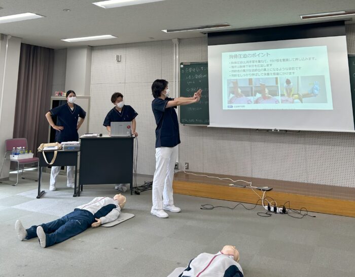ミニ講義では、胸骨圧迫のポイント、AEDのポイントをレクチャーしました。