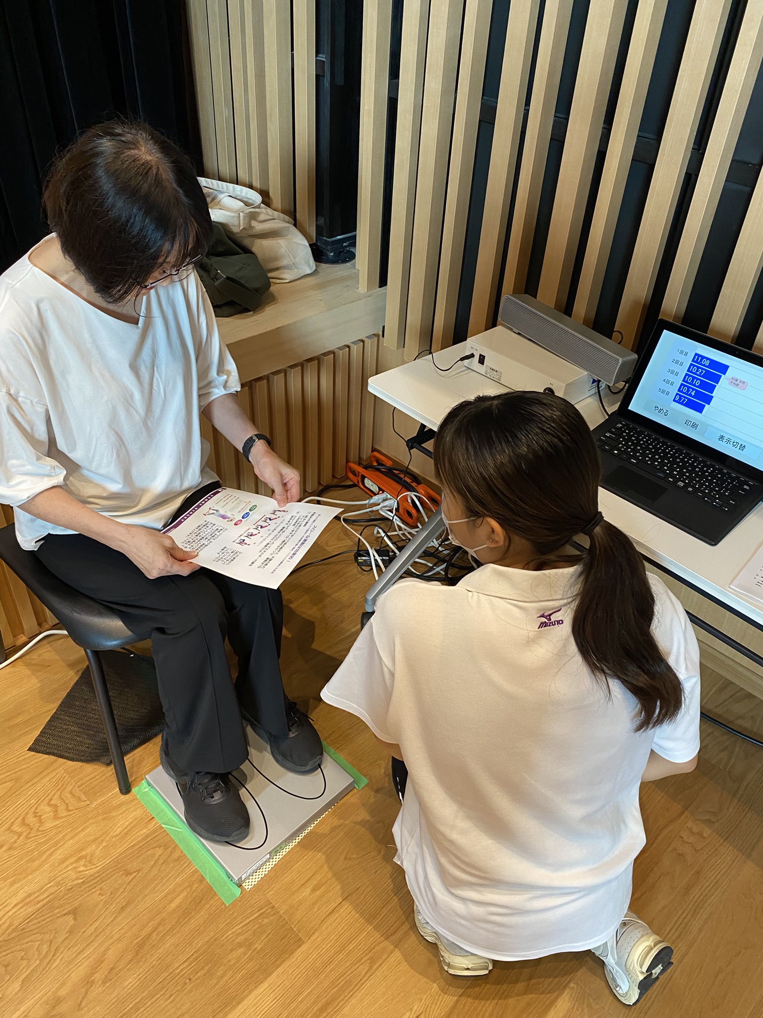 ブースでは、体育学科4年次生の大原沙智さんと藤原尊さん(ともに水泳部所属)が前回に続き測定に協力。立ち上がり方や測定結果について丁寧に説明しました。