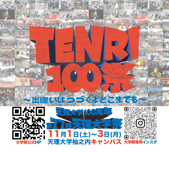 今年度の第77回天理大学祭は、「TENRI100祭~出逢いはつづくよどこまでも~」をテーマに様々なプログラムを実施します。