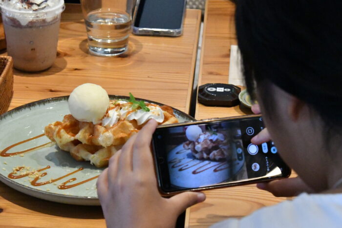 注文した商品が運ばれてきた際には、自分がその商品を見て「美味しそう」と思った第一印象を他の人にも伝えるには、どうすればよいかを考え、学生同士で工夫しながら撮影をしました。