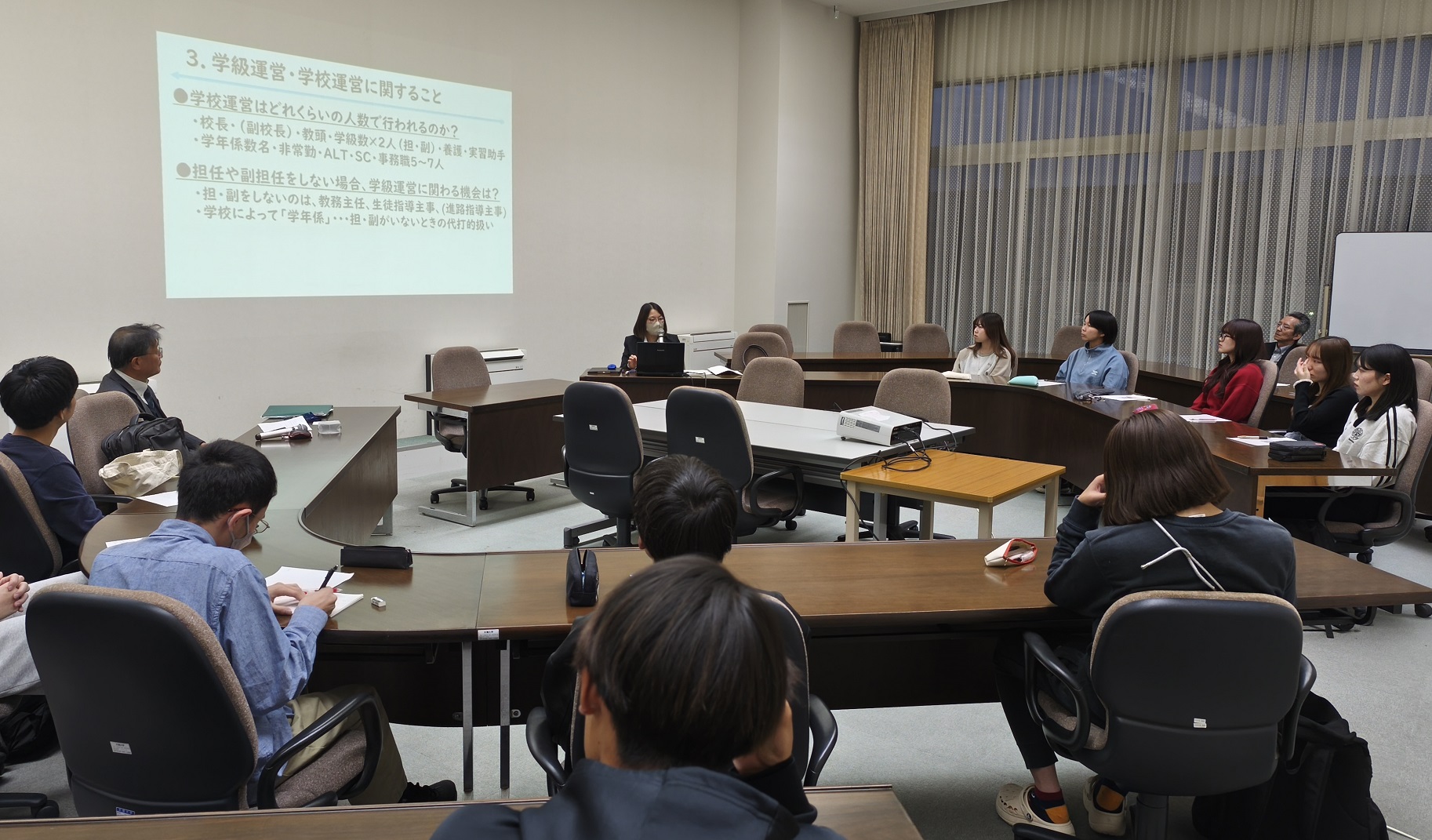 聴講した学生からは、「次年度の教育実習にむけて、実習中の注意点など、幅広くお話しを聞くことができてよかったです」(KMさん)「授業をおこなうコツとして、最初に目標を明確にすることや、友達同士で教え合うこと、生徒に発表してもらう時の生徒の当て方など、非常に参考になりました」(MJさん)「生徒指導の場面では、慎重な観察と教員同士の連携が必要だということがわかりました」(OMさん)といった感想が寄せられました。