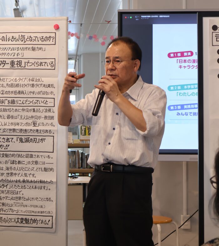 第1部は金巻先生により、今も高い大人気を誇る『鬼滅の刃』を題材に、日本の漫画の魅力についてキャラクター(登場人物)とストーリーから分析する講演が行われました。金巻先生は、小池一夫、司馬遼太郎といった著述家の言を引き、古典から新作までさまざまな漫画を例に出しながら、『鬼滅の刃』の主人公竈門炭治郎と仲間たちの魅力に加えて、最大の敵である鬼舞辻無惨の「ライバル」としての魅力、敵として登場する鬼たちの持つ魅力までも熱く語ってくれました。