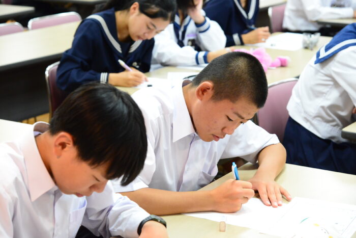 授業の冒頭、中村准教授は『坊っちゃん』の自筆原稿を提示し、「原稿を見て気づいたことをワークシートに書き出してみましょう」と生徒たちに呼びかけました。生徒たちは、初めて目にする自筆原稿に真剣な眼差しを向け、友人と意見を交わしながら気づいた点を丁寧に記入しました。