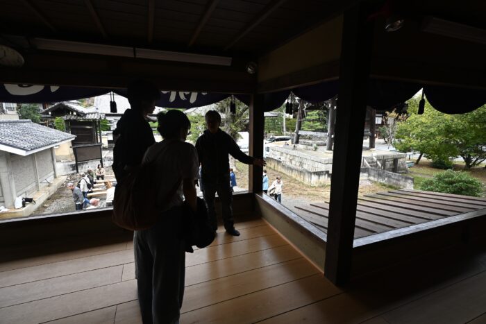 公演の見学に先立ち、参加した学生のために同保存会事務局長に御案内いただき、一般客があがることのできない狂言堂二階の舞台でお囃子や舞台装置の説明をいただきました。