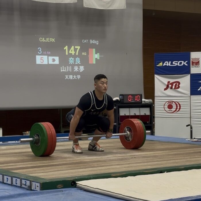 男子94kg級 山川 来夢(体育3)S 118kg、 C&J 147kg、トータル 265kg 6位