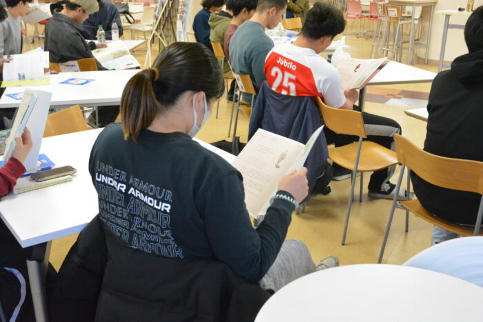 配布されたパンフレットをもとに、学生は「教育」「保健医療」「平和構築」「気候変動」から興味のある分野を選び、ストーリーを読み込んだ後、近くの参加者と意見交換を行いました。「義務教育が当たり前ではないと感じた」など、学生から率直な感想が発表されました。
