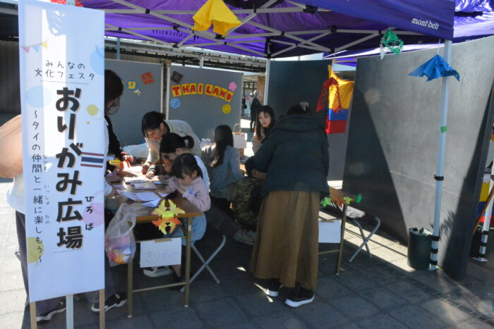 タイ語コースの学生やタイからの留学生、さらに本学「国際参加プロジェクト」でタイでの現地活動を経験したメンバーたちが、ハスの花の折り紙や、切り紙を紹介。次々に参加者がブースを訪れ、色とりどりの作品に大満足の様子でした。