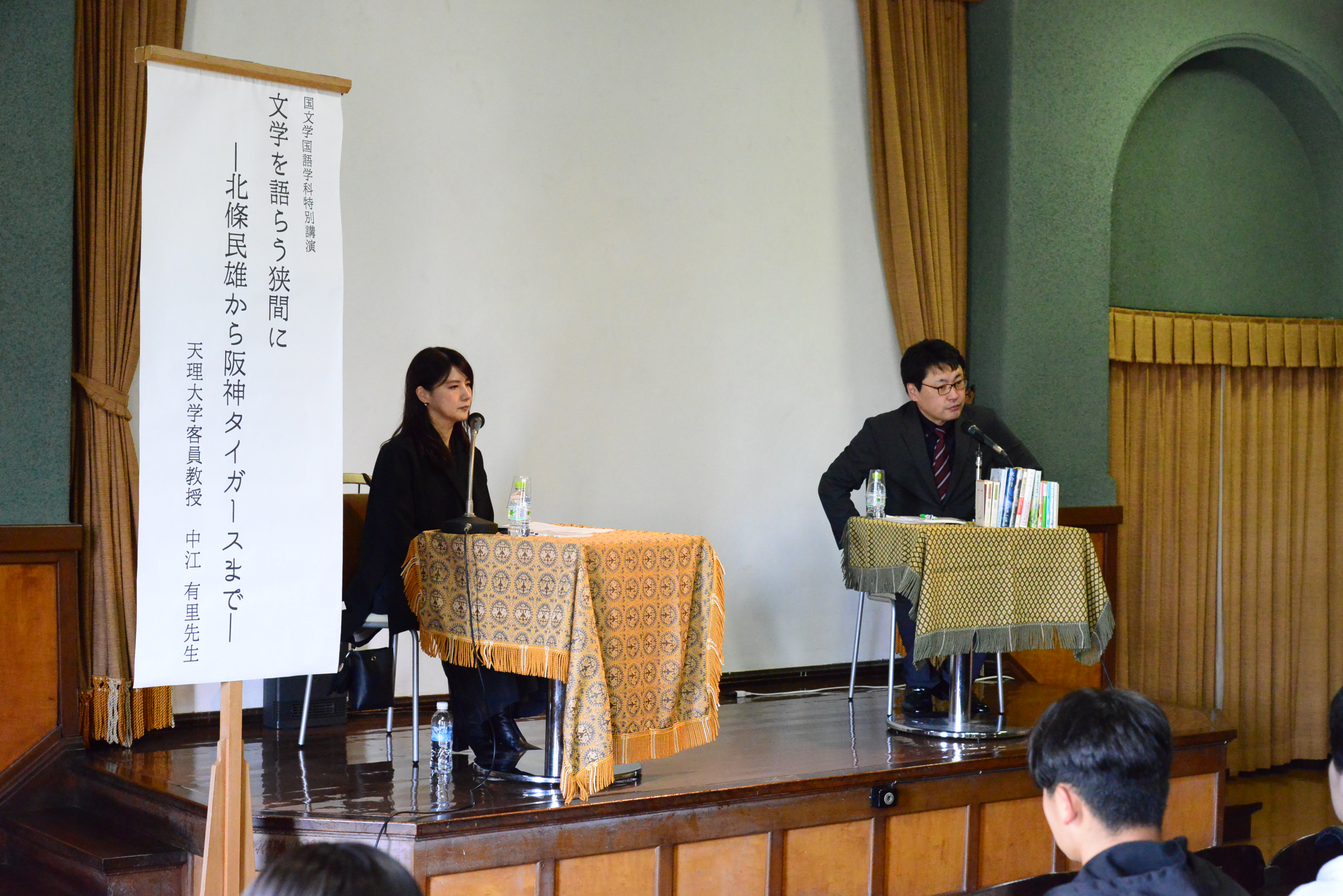 11月12日、天理大学付属天理図書館2階講堂にて、天理大学客員教授である中江有里(女優/作家/歌手)氏が「文学を語らう狭間に―北條民雄から阪神タイガースまで―」と題した特別講演を行いました。今年度は中村晋吾国文学国語学科准教授との対談を中心とする内容でした。