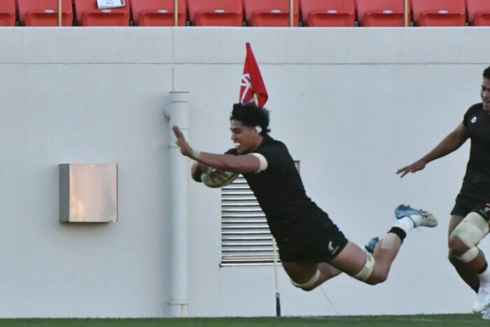後半も天理大の勢いは止まらず、後半3分、ラインアウトからモールを組み前進し、そのまま一気にHO稲嶺翔太選手(地域文化学科4年・石見智翠館)がトライ。コンバージョンキックも成功し、28対5とリードを広げます。後半30分、相手のパスミスから平松麟太郎選手が一気に22メートルラインまで持っていき、上ノ坊駿介選手がキックパスで、アリスター・サウララ選手へ繋げ、そのまま一気に加速し、ハットトリックとなるトライを挙げ、40対5とします。