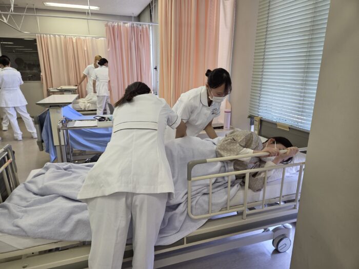 「成人看護学」の授業では、成人期の対象を理解し、成長・発達および健康状態に応じた看護の基礎を学んでいます。今回、成人期の対象理解を深めるため、脊髄損傷を患い両下肢麻痺のある患者さんに対し、看護を実践する実技演習を行いました。演習では4年生が患者を演じました。事前学習では、「どのような観察が必要か」、「患者さんからどのような訴えがありそうか」を考え、イメージを膨らませて実技演習に臨みました。