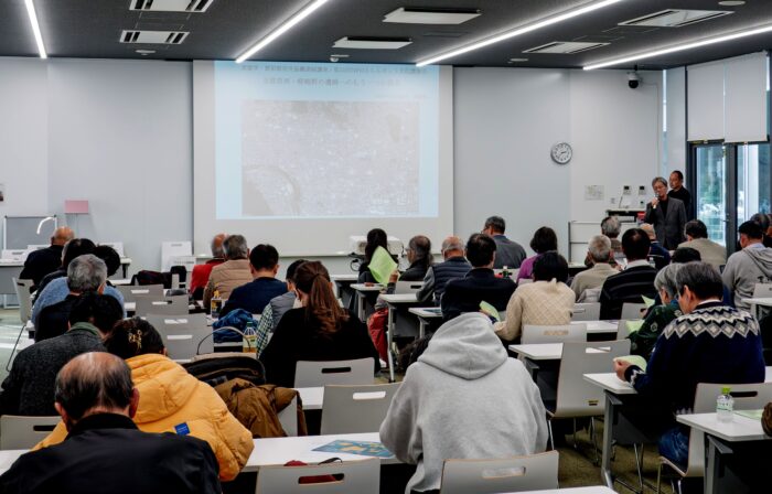 第4回現地調査では、京都学歴彩館(京都市左京区)で開催された市民向け講演会に参加しました。NPOさらんネットは、京都西郊の嵯峨・嵐山地域の地域活性化や魅力発信に取り組んでおられる団体です。本実習でお世話になっている嵯峨大念仏狂言保存会の加納敬二事務局長は、当NPOの副理事長を務められているほか、公益財団法人京都市埋蔵文化財研究所の元職員として、40年にわたり京都市内の埋蔵文化財の発掘調査・研究に従事されていました。今回の講演では、加納敬二氏が講師として演台にたち、「京都洛西・嵯峨野の遺蹟へのもう一つの視点〜秦氏の痕跡を探る〜」という題目で講演されました。