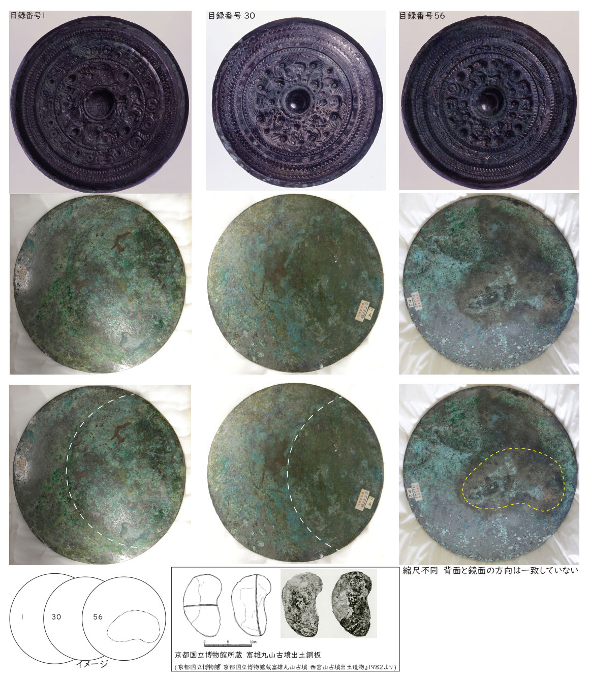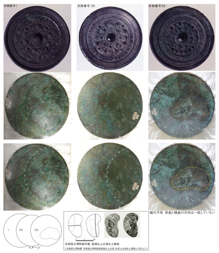 目録番号1、30の鏡面には副葬されていた時に、ほかの鏡が重なっていた痕跡が認められる。(写真下段白色の点線)。痕跡の直径から推定して1、30、56の順に重なっていたと考えられる。最も上になっていたことになる56の鏡面には、ほかの副葬品の痕跡が数カ所認められる。そのひとつは勾玉のような形を呈し(写真下段黄色の点線)、この形の副葬品が長期間上に乗っていたことがわかる。