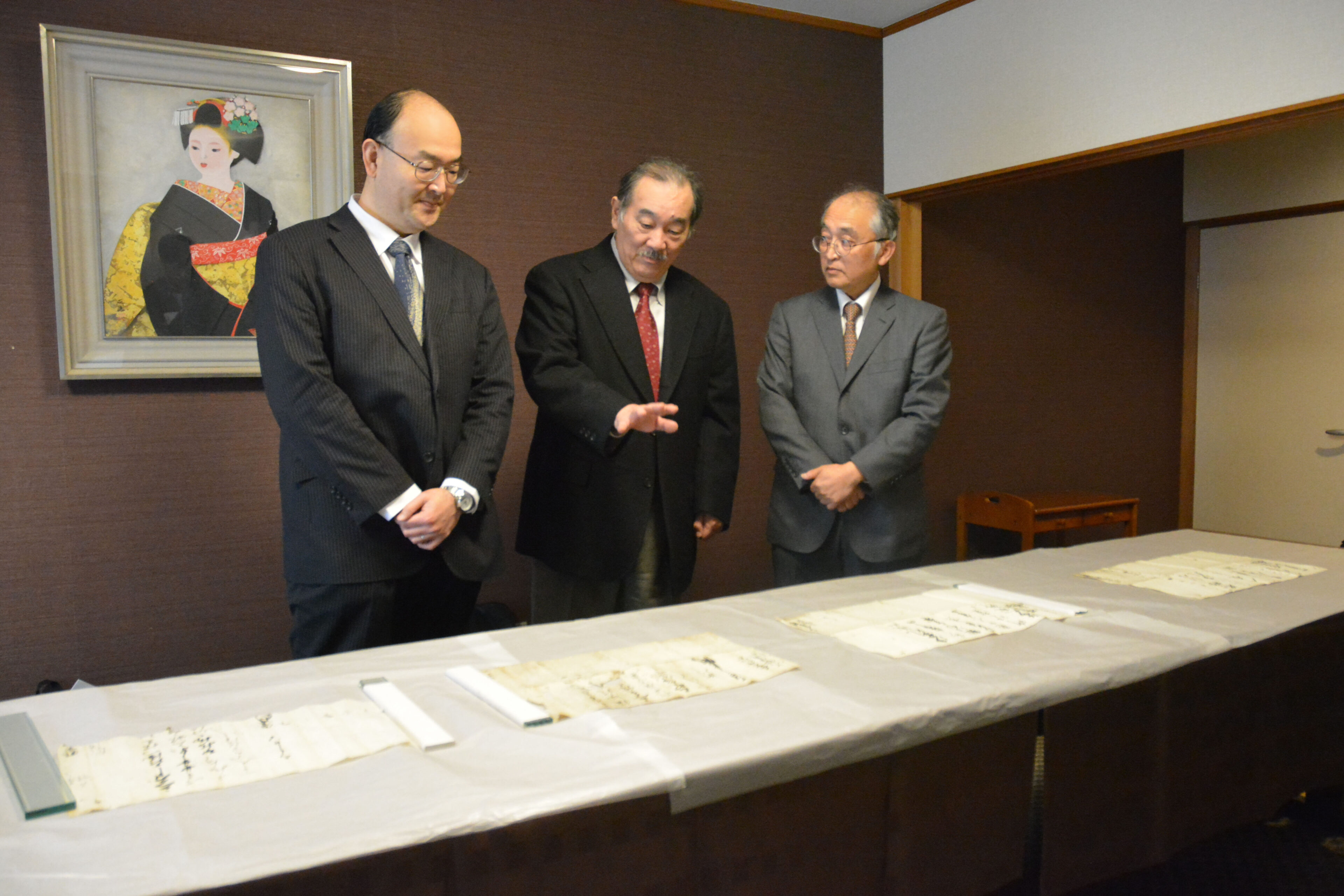 今回の報告会では、とくに戦国・織豊期(16世紀後半)に関わる未公開史料6点を初公開し、その内容と意義について両教授が解説しました。