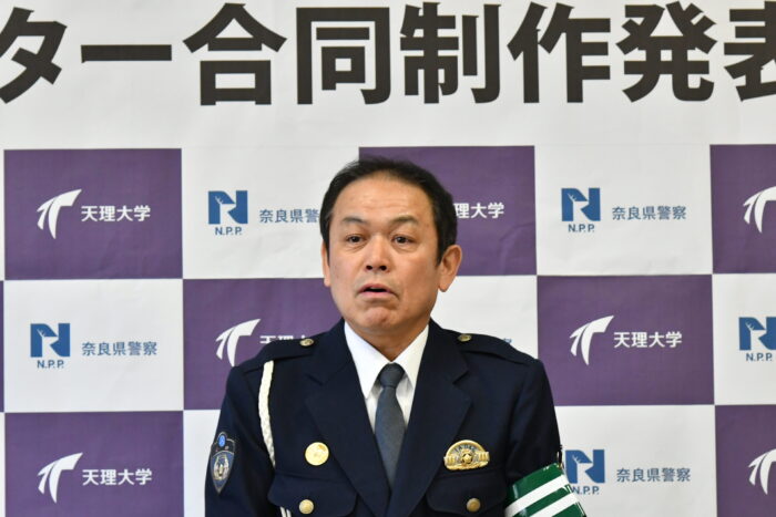発表会には、天理大学の永尾比奈夫学長、天理警察署の山本英二署長のほか、ポスターに出演した学生自治会メンバー4名が出席しました。