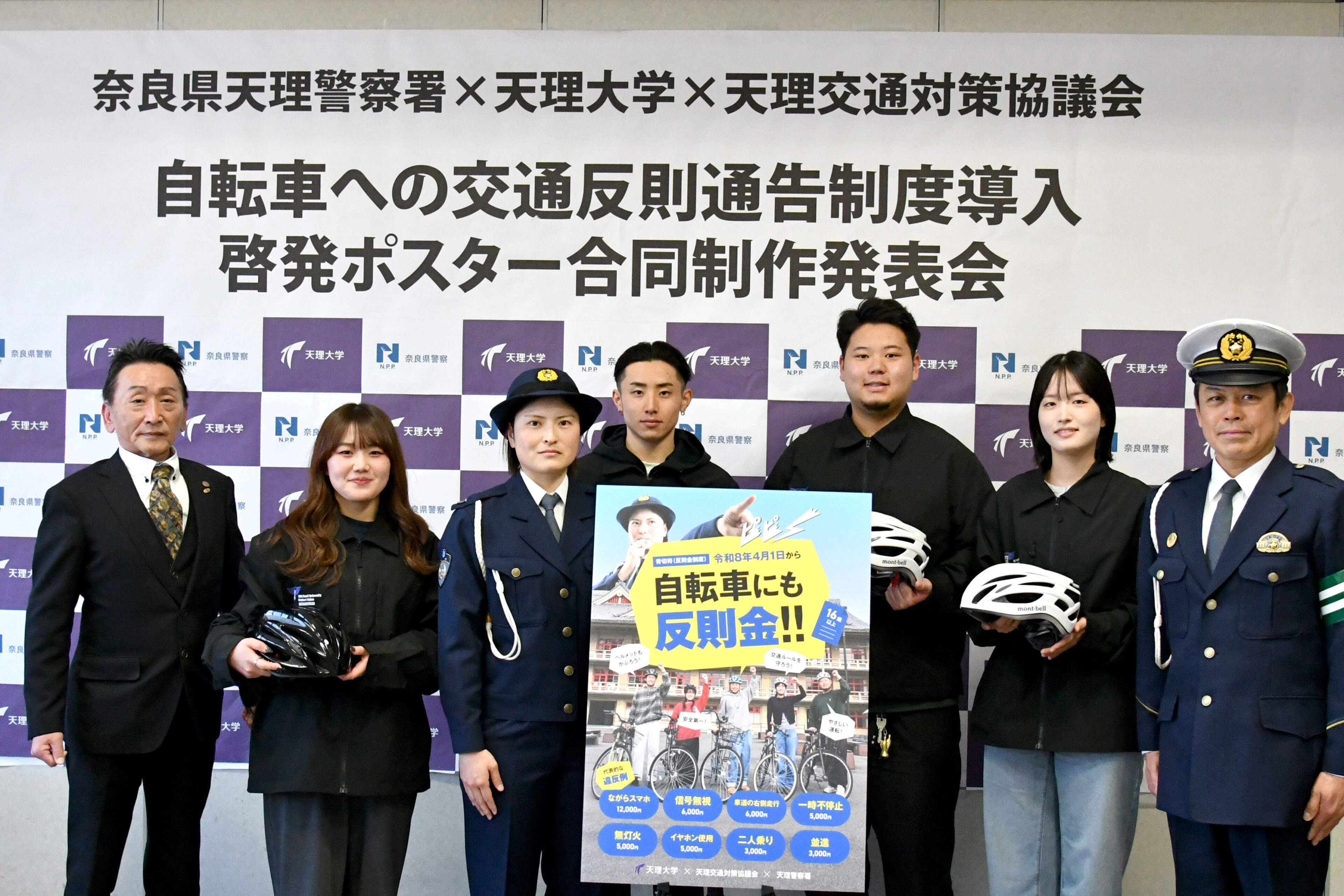 3月16日、天理大学は天理警察署、天理交通対策協議会と協働し、自転車の「交通反則通告制度(通称“青切符”)」を周知する啓発ポスターの合同制作発表会を、天理警察署にて開催しました。