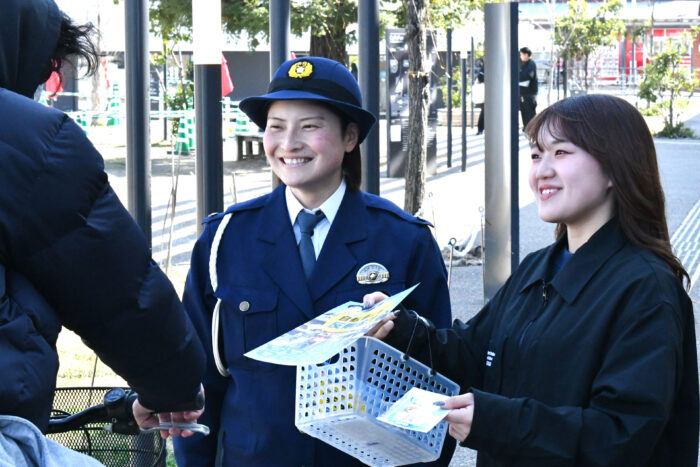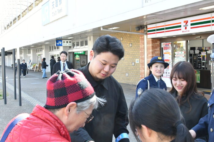 発表会後、学生自治会メンバーと天理警察署員らは、天理駅周辺でポスター掲示やチラシ配布を行い、通行者に自転車の交通ルール遵守を呼びかけました。