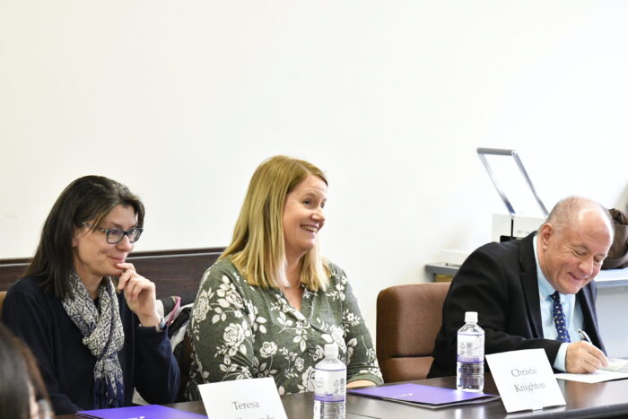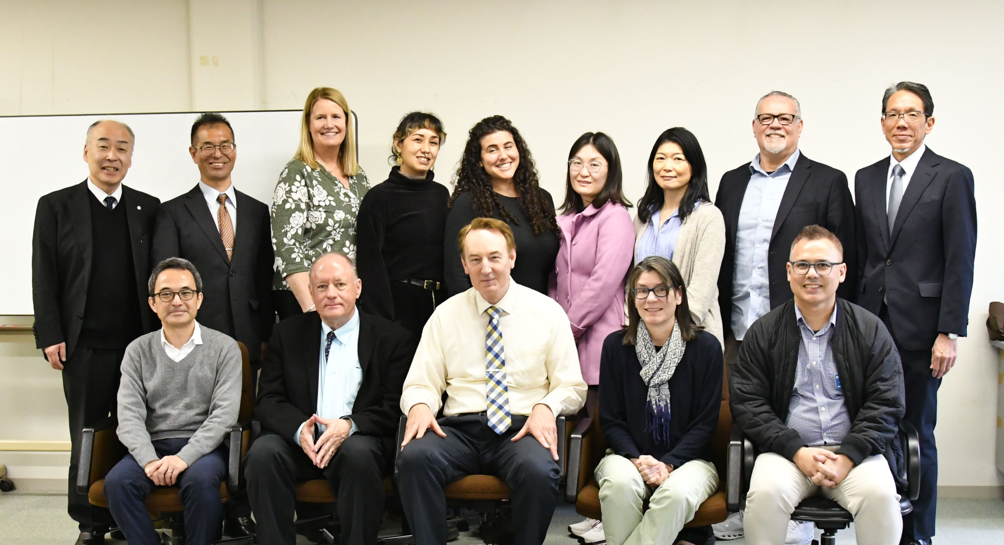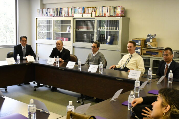 当日は、本学教職員の案内のもと、一行はまず天理教教会本部を見学。その後、杣之内キャンパスへ移動し、本館(研究棟)内の英米語学科共同研究室にて、両校の教育内容や学生支援のあり方、国際教育を取り巻く課題と今後の展望について意見交換を行いました。
