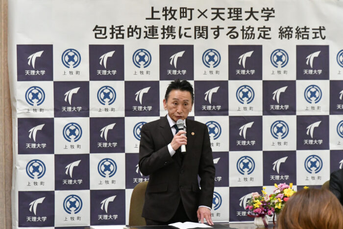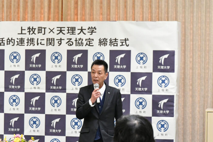 署名後、挨拶に立った阪本町長は、「部活動の地域移行における指導者派遣をはじめ、協定に基づく天理大学との連携に大きな期待を寄せています。子どもたちの体力づくりや、外国籍の子どもたちに対する語学支援など、これまでの取り組みを踏まえた上で、地域の課題解決に向けて連携協力を深めていきたいと考えています」と、今後の連携に期待する旨を語りました。