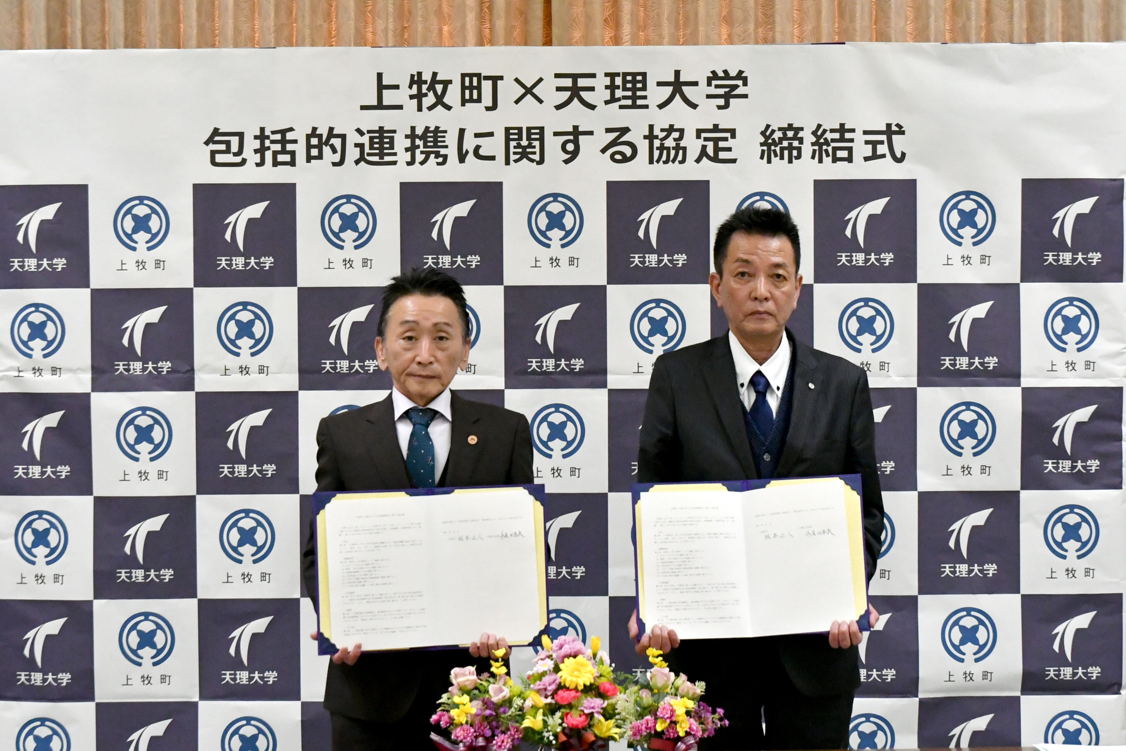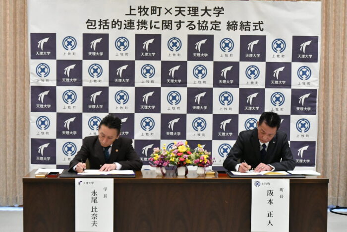 3月27日、天理大学(永尾 比奈夫学長)は、上牧町(阪本 正人町長)と包括連携協力に関する協定締結式を執り行いました。