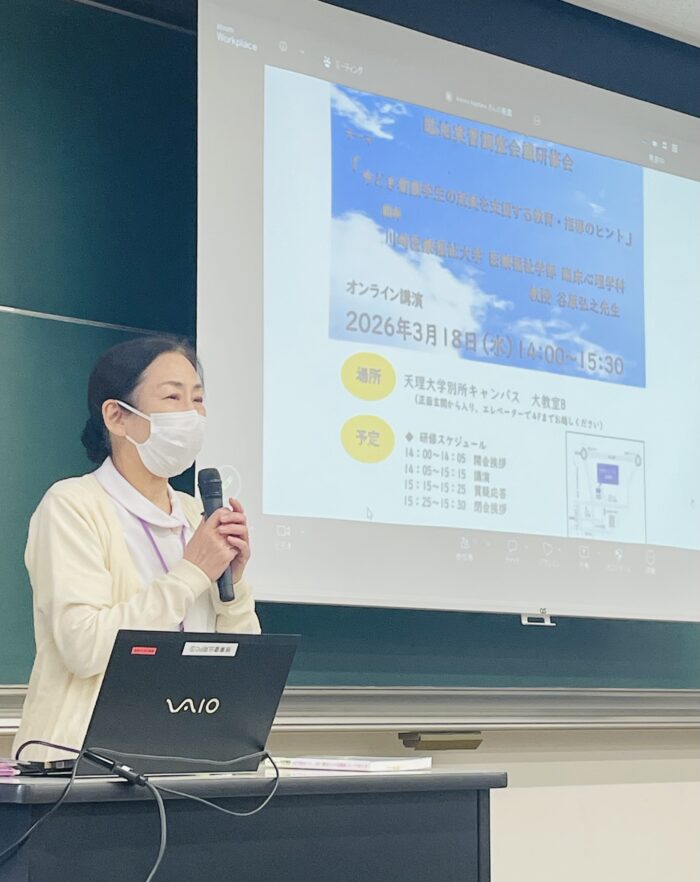 2026年3月18日(水)、天理大学別所キャンパスにおいて「2025年度 臨地実習調整会主催研修会」を開催いたしました。本研修会では、川崎医療福祉大学 医療福祉学部 臨床心理学科 教授 谷原弘之先生に講師をお願いし、「今どき看護学生の成長を支援する教育・指導のヒント」をテーマにご講演いただきました。