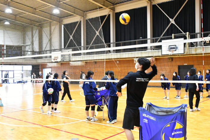 天理市立西中学校では、天理大学バレーボール部に所属する学生4名(男女各2名)が指導を担当しました。基礎練習を中心に、生徒一人ひとりの習熟度や状況に応じた丁寧な指導が行われました。学生たちは、「ナイス!」「惜しい、もう少し」といった前向きな声がけを積極的に行い、生徒たちの挑戦を後押しする姿も見られました。
