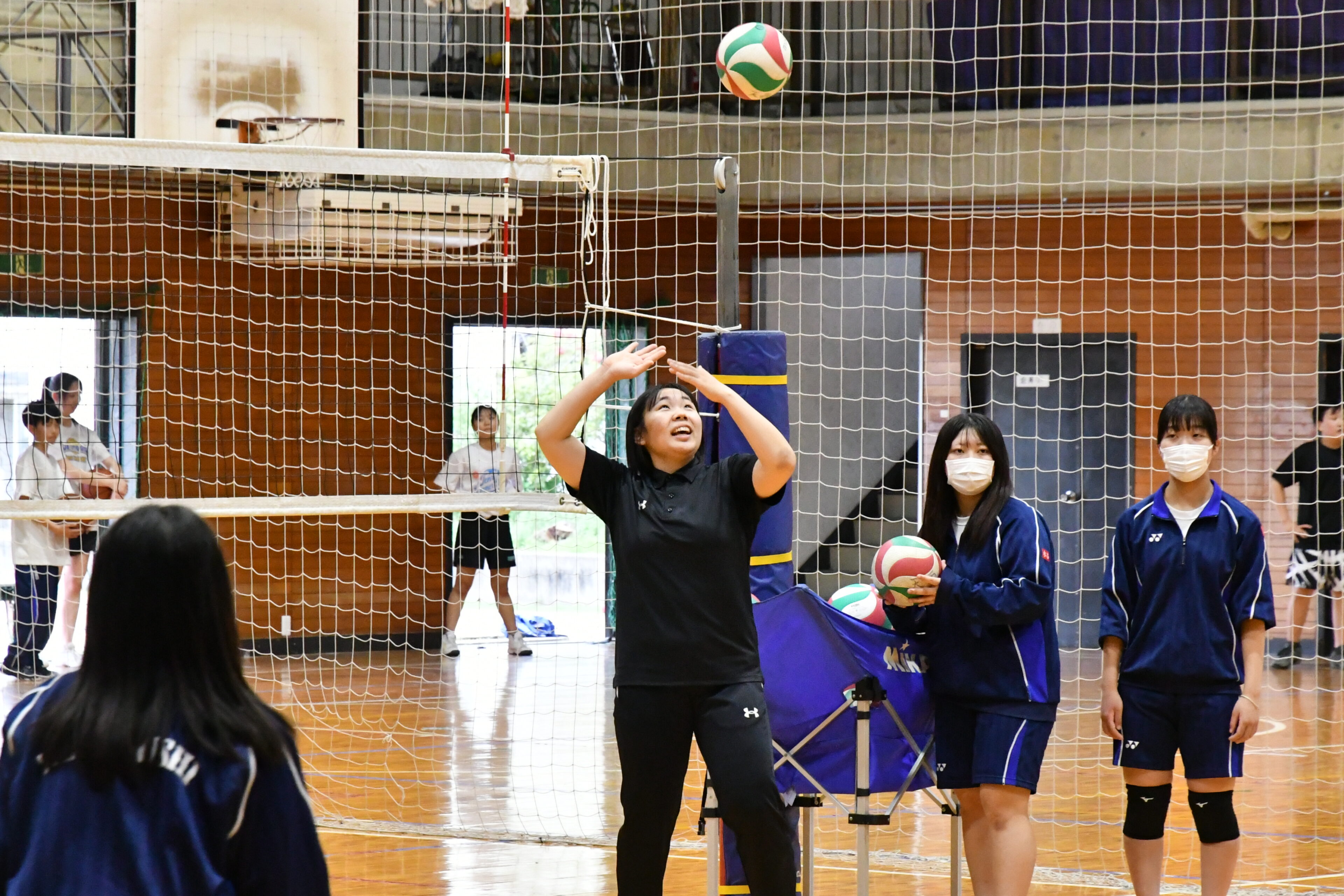 中学生への声のかけ方や、分かりやすく伝える言葉づかいを意識して指導しています。中学生と一緒に楽しくバレーボールに取り組む中で、自分たちが練習の中で意識すべき点に気づくことができ、自分たちの学びにもなっています。